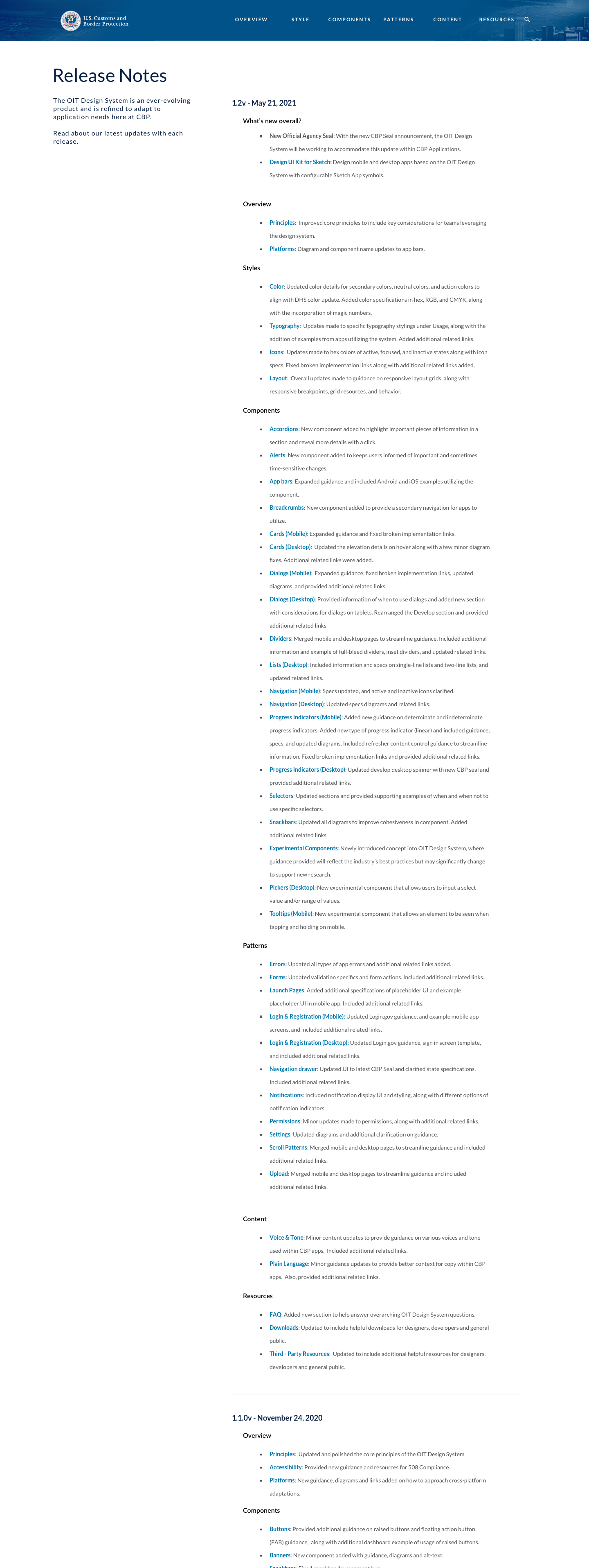 The CBP OIT Design System is an internal comprehensive design resource that aims to ensure consistency across all of CBP’s Office of Information Technology (OIT) applications. It is a centralized collection of reusable components, principles, guidance, assets, and other resources that follow a specific look and feel that expands across CBP OIT.